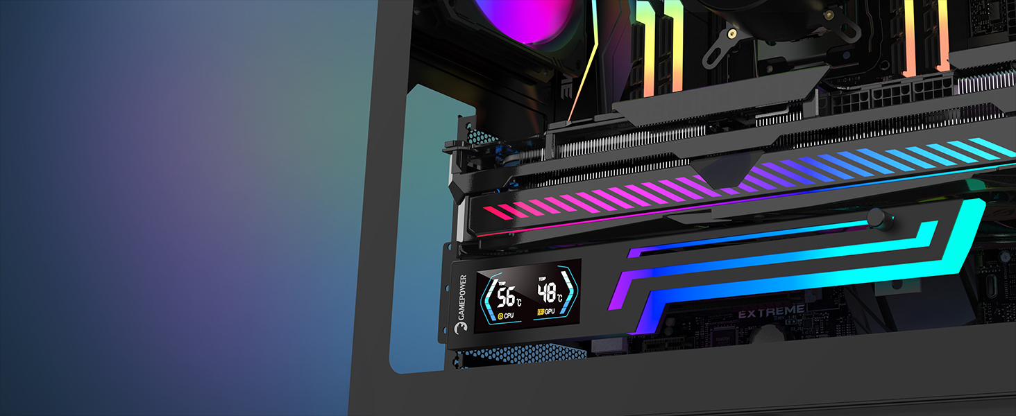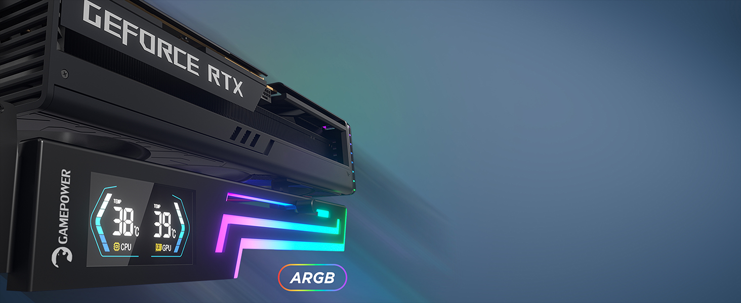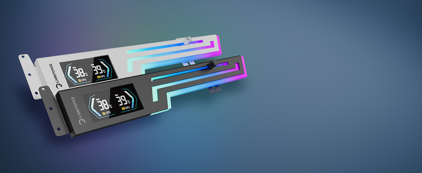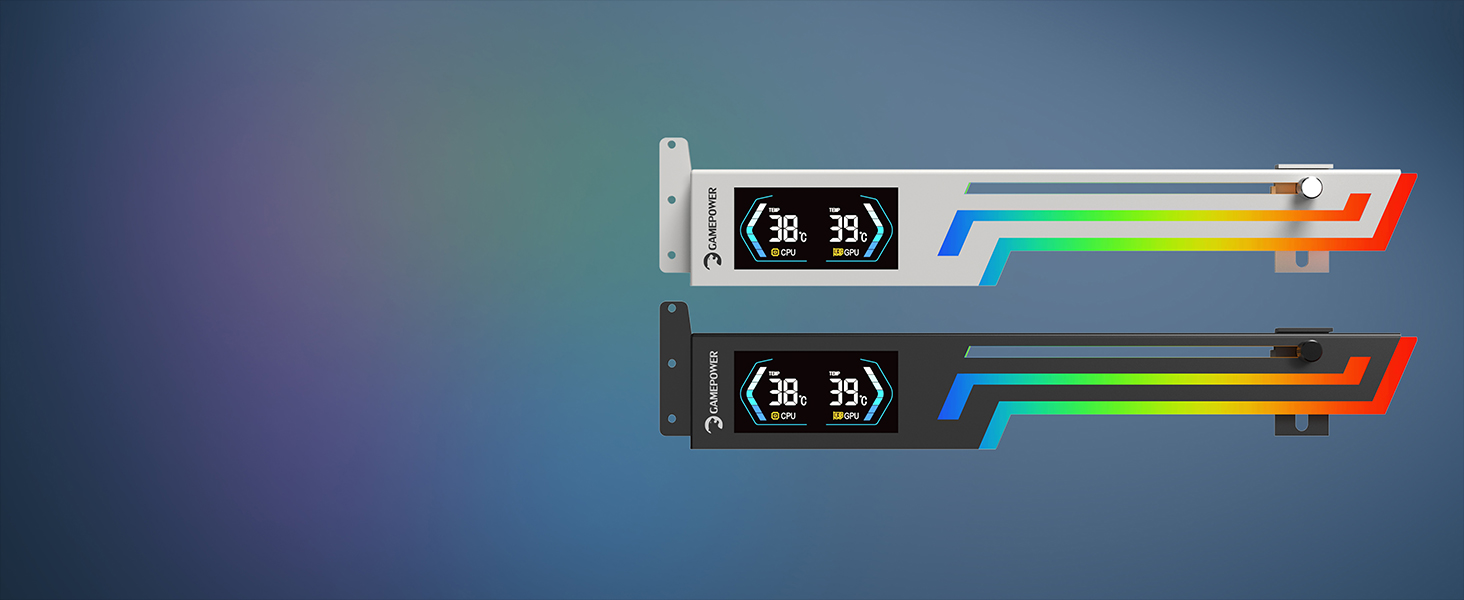 Gamepower Heatsync ARGB LCD GPU Halter – Echtzeit-CPU/GPU-Temperaturanzeige, robuste Metallkonstruktion, verstellbares Schiebedesign und lebendige 5V 3-Pin ARGB-Beleuchtung, kompatibel mit den wichtigsten Mainboard-Marken.